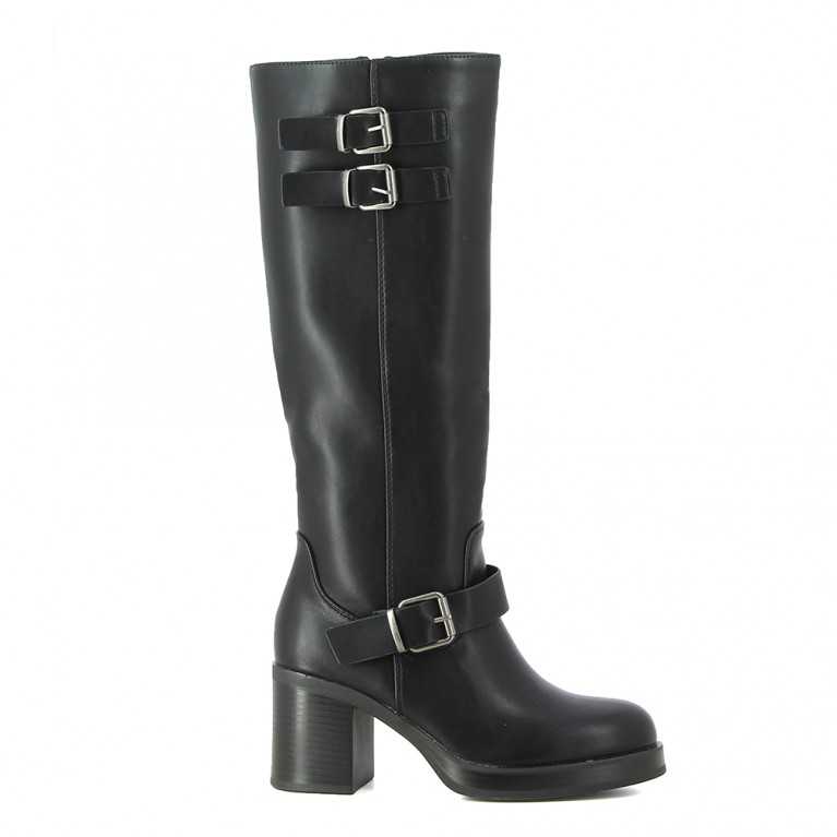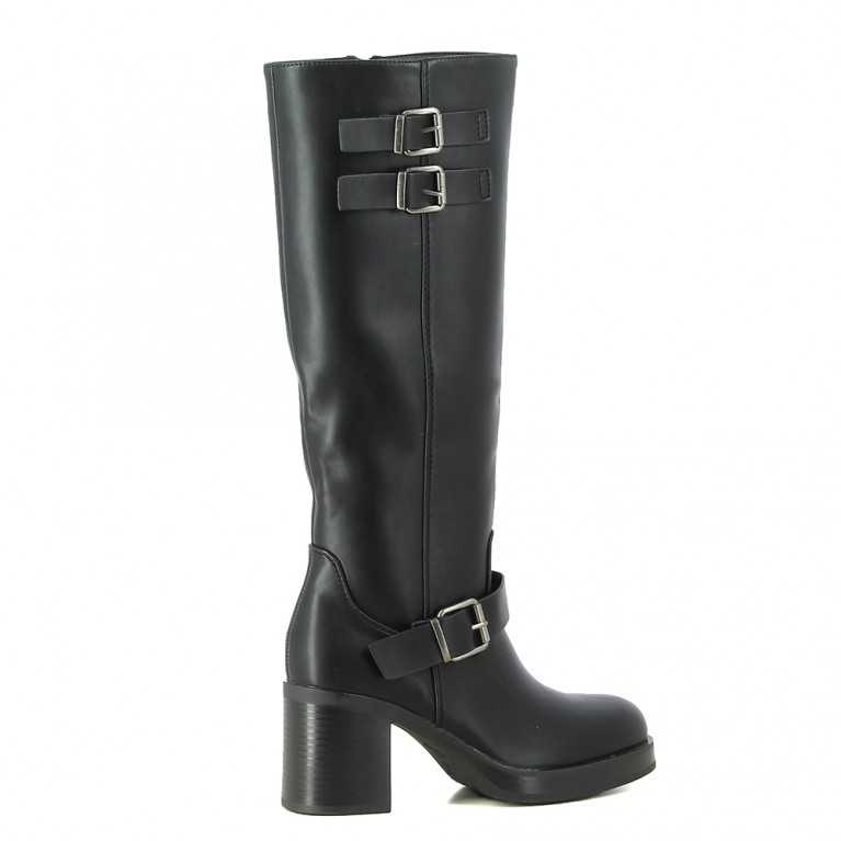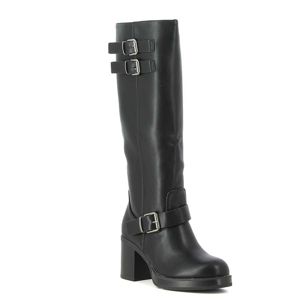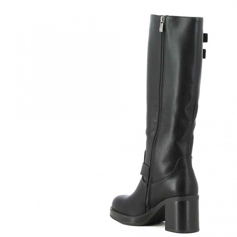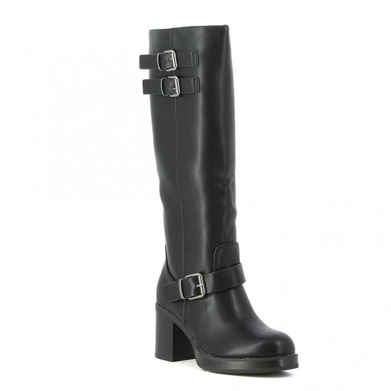 Botte en simili à talon avec boucles et zip pour faciliter le passage du pied.