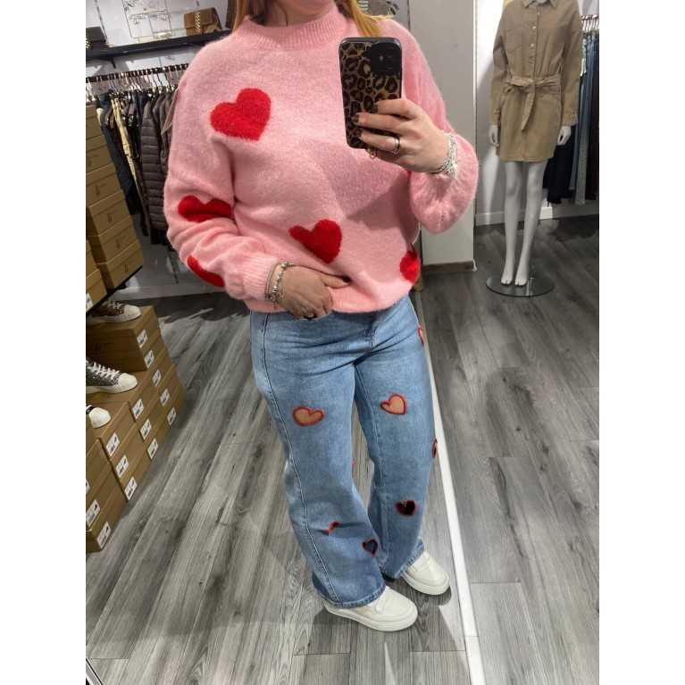 Pull rose avec cœurs rouge
